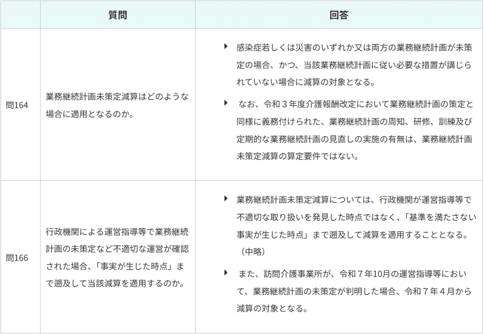 QAに示されているとおり、業務継続計画未策定減算は、BCPの周知や研修、訓練を実施していなくても減算対象となりません。ただし、減算対象にならないだけであって、これらは基準省令により義務付けられているものですから実施しておいてください。