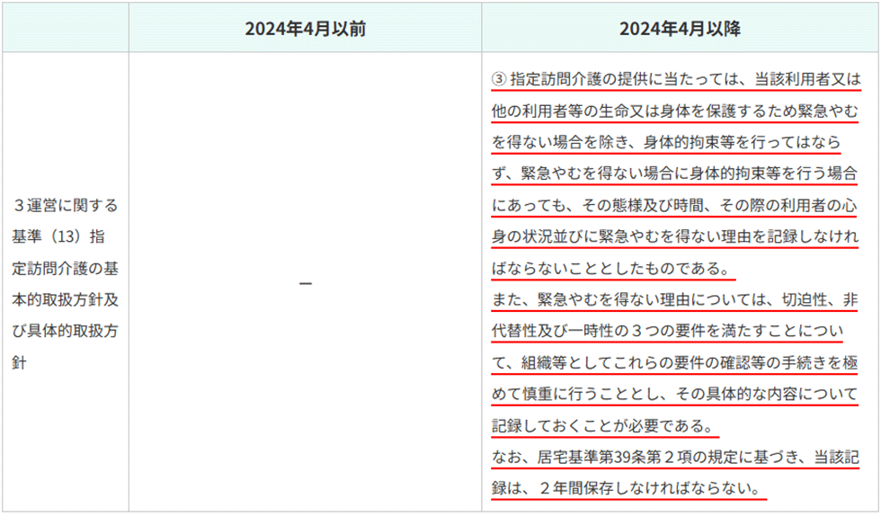 訪問系サービス、通所系サービス、福祉用具貸与、特定福祉用具販売及び居宅介護支援について、利用者又は他の利用者等の生命又は身体を保護するため緊急やむを得ない場合を除き、身体的拘束等を行ってはならないこととし、身体的拘束等を行う場合には、その態様及び時間、その際の利用者の心身の状況並びに緊急やむを得ない理由を記録することを義務付ける。