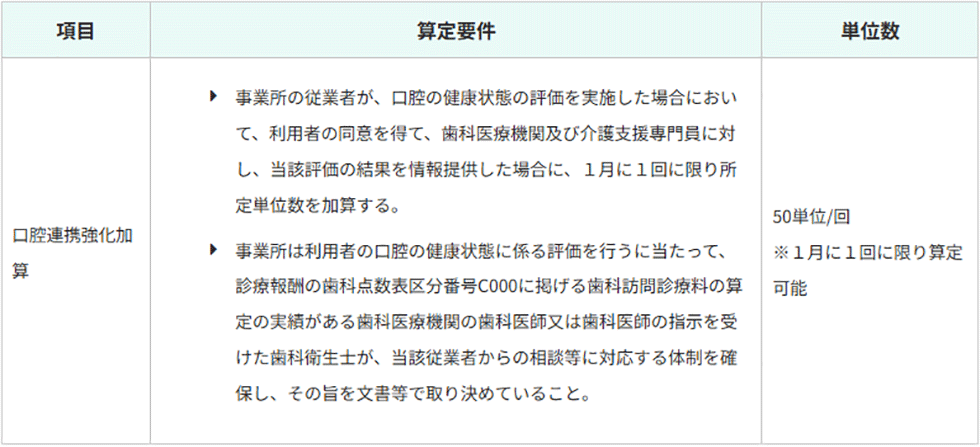訪問介護、訪問看護、訪問リハビリテーション、短期入所生活介護、短期入所療養介護及び定期巡回・随時対応型訪問介護看護において、職員による利用者の口腔の状態の確認によって、歯科専門職による適切な口腔管理の実施につなげる観点から、事業所と歯科専門職の連携の下、介護職員等による口腔衛生状態及び口腔機能の評価の実施並びに利用者の同意の下の歯科医療機関及び介護支援専門員への情報提供を評価する新たな加算を設ける