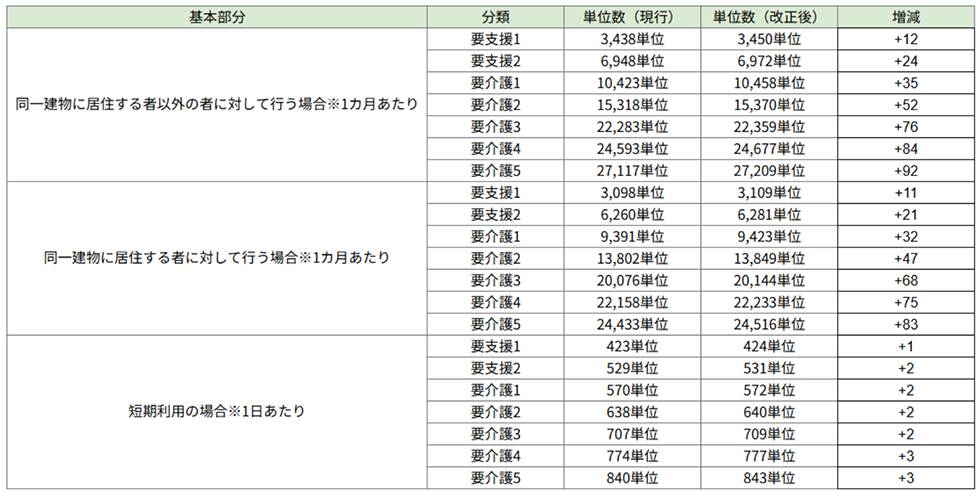 小規模多機能型居宅介護の基本報酬はすべての分類で引き上げられました。改定前後の基本報酬についての比較表は以下の通りです。