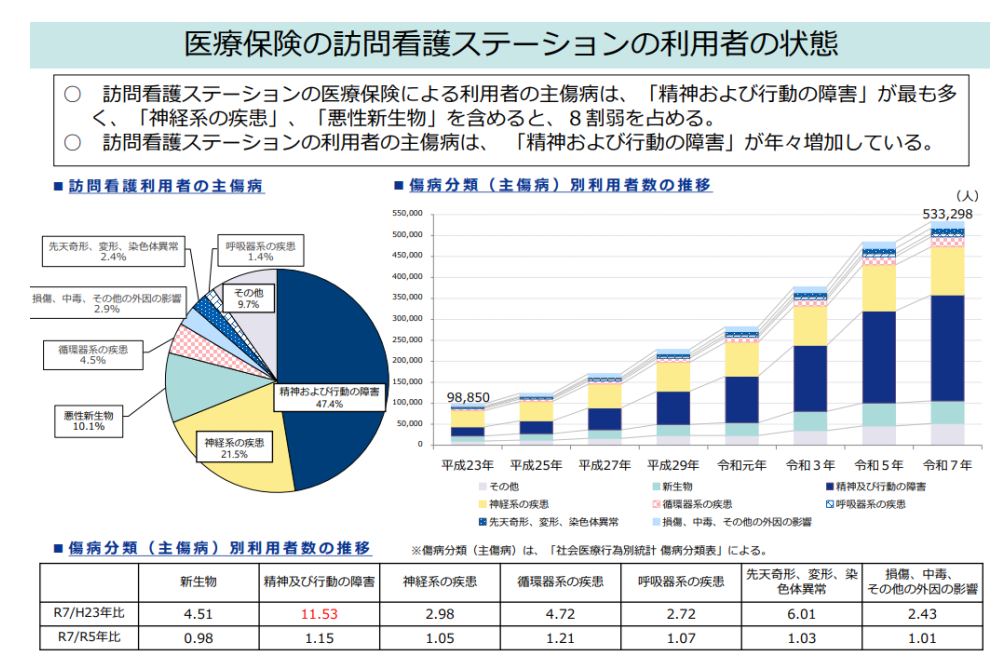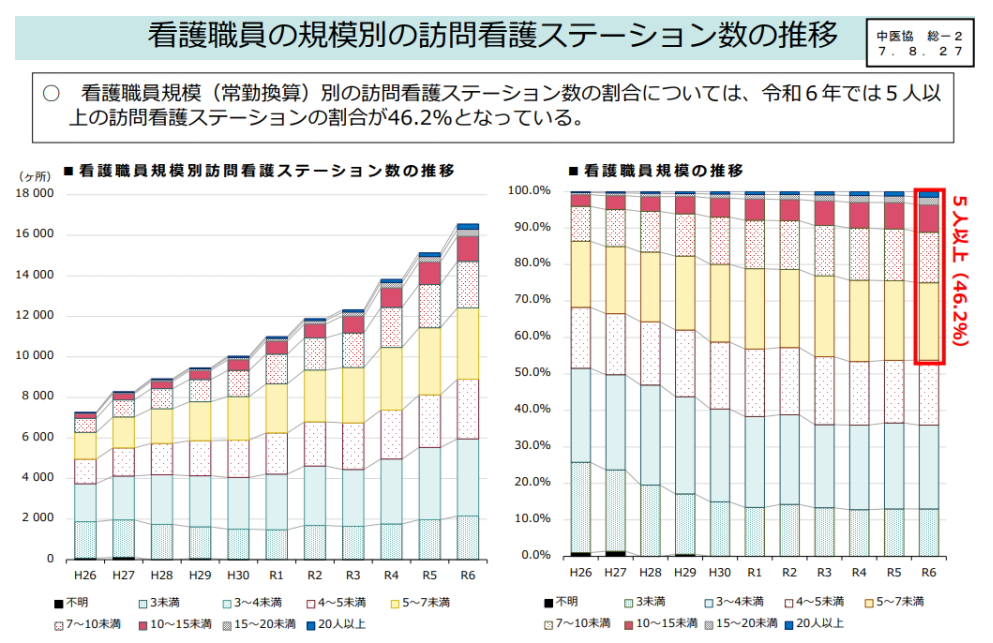 また、医療保険の訪問看護の利用者の主傷病は、「精神および行動の障害」が最も多く、年々増加しています。なお、訪問看護ステーションの事業所数は増えており、その中でも看護職員数が5人以上の中規模事業所の割合が増加しています。