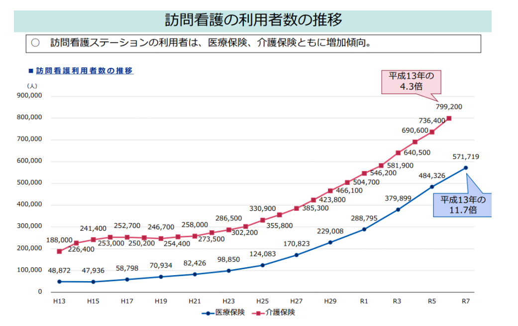 訪問看護ステーションの利用者数は、医療保険、介護保険ともに増加傾向にあります。