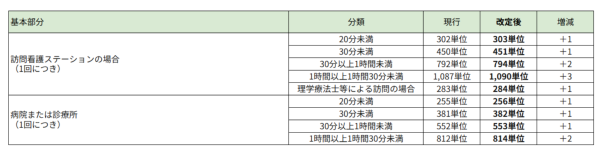 基本報酬は全体としてプラス改定となりました。基本単位は訪問看護ステーションの場合で1~3単位、病院又は診療所の場合で1~2単位(いずれも1回につき)引き上げられました。また、定期巡回・随時対応型訪問介護看護サービスと連携する場合は、月に7単位の引き上げとなっています。改定前後の基本報酬についての比較表は以下の通りです。