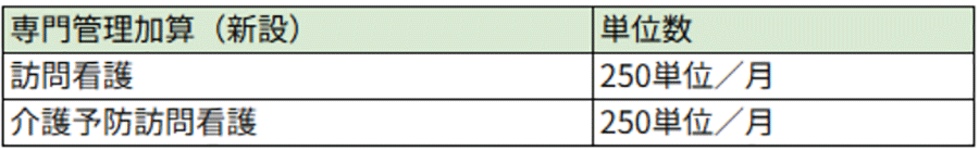 医療ニーズの高い訪問看護利用者が増加する中、より質の高い訪問看護を適切に提供するため、専門性の高い看護師が指定訪問看護などの実施に関して計画的に管理を行う取り組みを評価する新たな加算が設けられました。