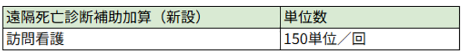 離島等に居住する利用者の死亡診断について、診療報酬における対応との整合性を図る観点から、ターミナルケア加算を算定し、看護師が情報通信機器を用いて医師の死亡診断の補助を行った場合に算定できる新たな加算が設けられました。