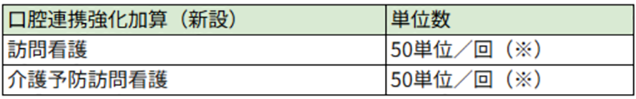 - 事業所の従業者が、口腔の健康状態の評価を実施した場合において、利用者の同意を得て、歯科医療機関及び介護支援専門員に対し、当該評価の結果を状況提供した場合に、1ヶ月に1回に限り所定単位数を加算する。