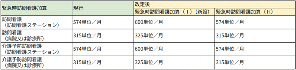 訪問看護等における 24 時間対応体制を充実する観点から、夜間対応する看護師等の勤務環境に配慮した場合を評価する新たな区分である「緊急時訪問看護加算(Ⅰ)」が新設されました。