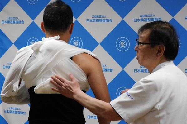 整復・固定施術技術実習として、山口登一郎講師より鎖骨骨折および肋骨骨折の整復・固定法について解説が行われた。
