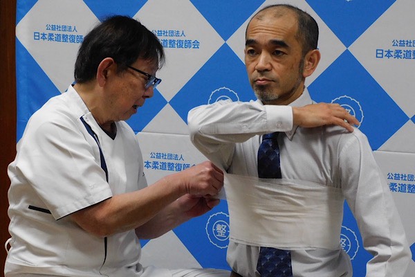 肋骨骨折の場合は、バストバンドだけでなくさらしを半分に割いたものを巻いて、その上からバストバンドを使用したほうが患部が安定する。医科から転院してきた肋骨骨折の患者の多くはバストバンドのみの固定だと思われるが、包帯やさらしを併用して固定した方が患者さんも楽で、痛みもかなり違う〟と説明した。